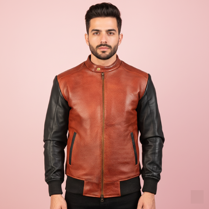 Be the first to review “Black & Maroon Leather Bomber Jacket – Stylish Two‑Tone Design”
