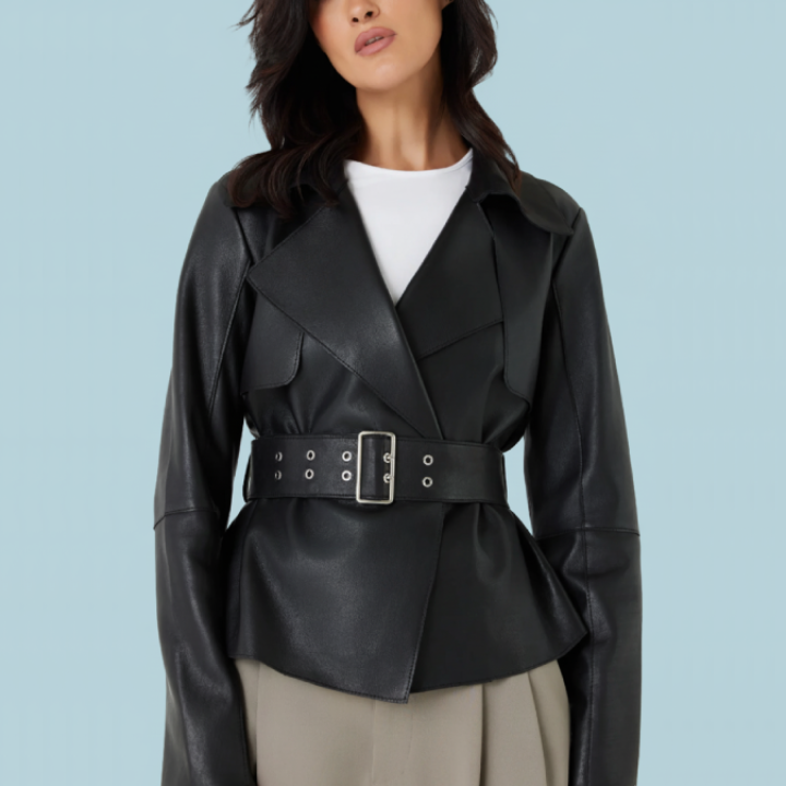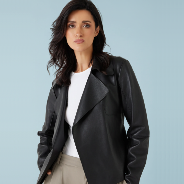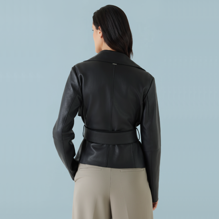CLARICE is a modern version of the classic double-breasted trench coat. CLARICE is crafted in our genuine lamb leather and fused with a soft Italian knit. The jacket features a large lapel collar, raw-edge seamwork, a double-prong buckle belt, a back vent, and 2 shoulder ‘gun flaps’ on the front. Use the belt to cinch your waist as you layer it over everything from dresses to jeans to skirts.