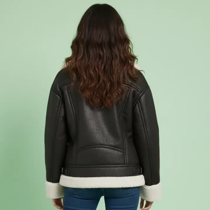 Featuring a classic aviator-inspired design, the jacket includes a structured collar, long sleeves, and a soft borg-style lining that provides warmth during colder days. The sleek black color adds versatility, allowing it to be easily paired with jeans, boots, or casual outfits.