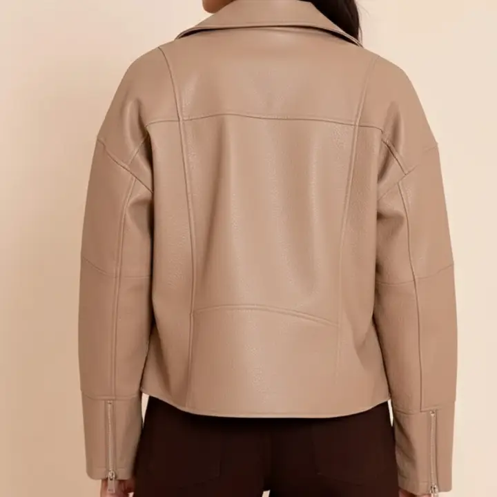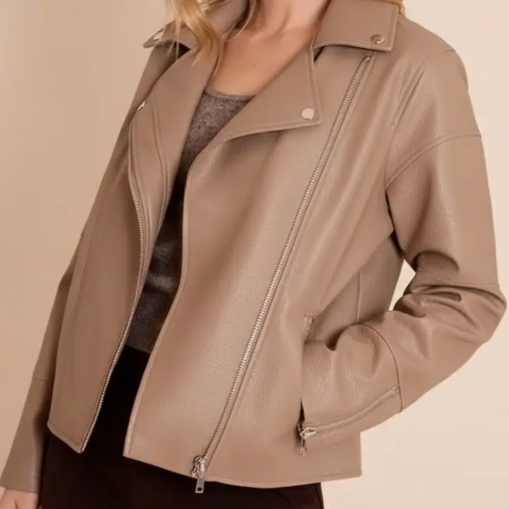 Crafted from premium faux leather in a stylish taupe shade, the jacket offers a unique alternative to traditional black leather jackets. The neutral tone makes it incredibly versatile, allowing you to pair it effortlessly with jeans, trousers, dresses, or casual everyday outfits.